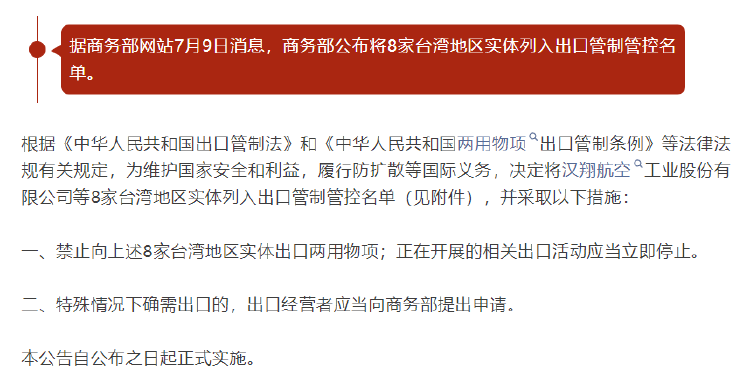 环球时报-枢密院十号消息,中国商务部9日宣布将8家台湾地区实体列入出口管制管控名单,禁止向其出口两用物项。老司机仔细查了一下,这些台湾实体几乎覆盖了所有台军自制装备的生产单位,涉及台湾各军种的先进装备。可以说,台军未来装备的研制发展之路,基本被卡死了。