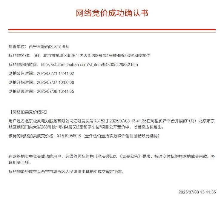 此外,竞买记录显示,此次拍卖共有7人报名,从7月8日8时7分起,首次出价为11,849,589.6元,经过203次竞价,最终北京极风电力服务有限公司通过竞买号“K3153”,于7月8日13时41分以1519.96万元的价格成功拍下该资产。