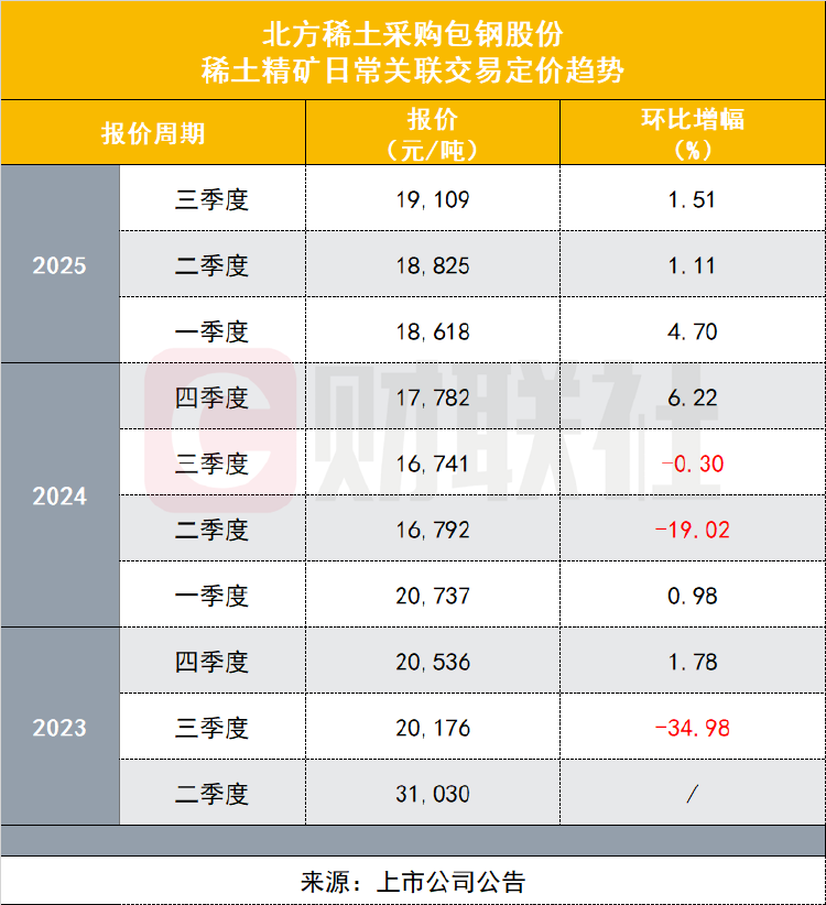 财联社整理了自2023年二季度以来,北方稀土每个季度采购包钢股份稀土精矿日常关联交易的价格: