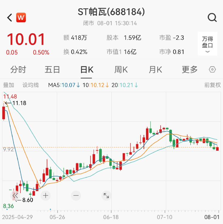 截至8月1日收盘,ST帕瓦股价报10.01元/股,总市值为16亿元。