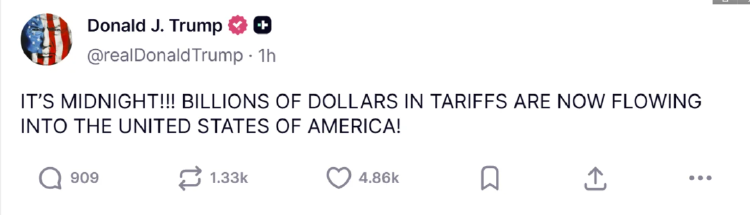 美国总统特朗普8月7日在社交媒体平台“真实社交”上宣布了“对等关税”生效的消息。(图源:“真实社交”平台)