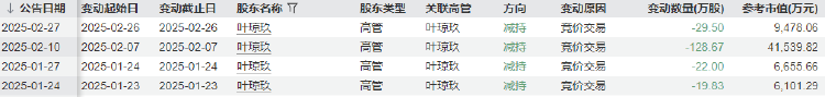 今年以来,第二大股东叶琼玖(现任公司董事兼副总经理)也完成了共计200万股(占总股本的0.37%)的减持,减持均价318.87元,合计减持市值6.38亿元。