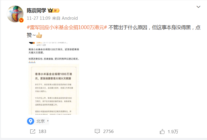 11月27日上午,“小米公益基金会”官微宣布,香港小米基金会捐赠1000万港元,紧急驰援香港大埔火灾救援。随后,#雷军回应小米基金会捐1000万港元#话题登上微博热搜,知名大V、汽车博主陈震带话题发布微博称:不管出于什么原因,但这事本身没得黑,点赞。