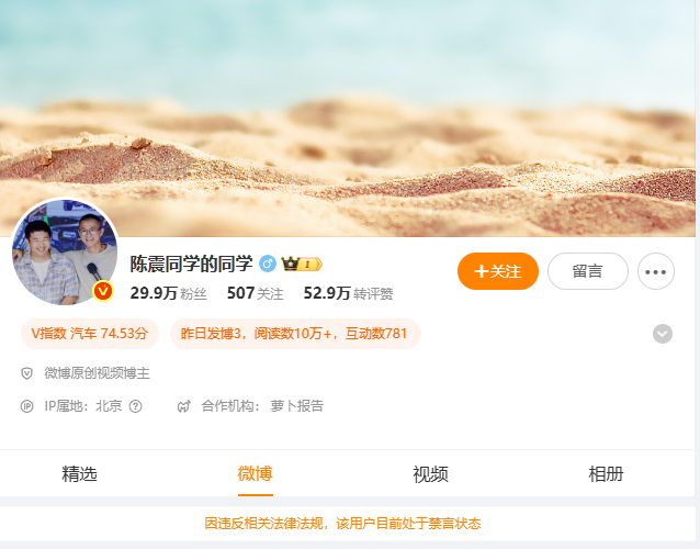 知名车评人陈震多个社交媒体平台账号被禁言后,陈震本人12月5日通过另一个账号“陈震同学的同学”发文回应称:“好好反思一下...…”(早前报道:大V陈震被全网禁言后首度发声:好好反思 检讨自己)目前,@陈震同学的同学显示也已被禁言。