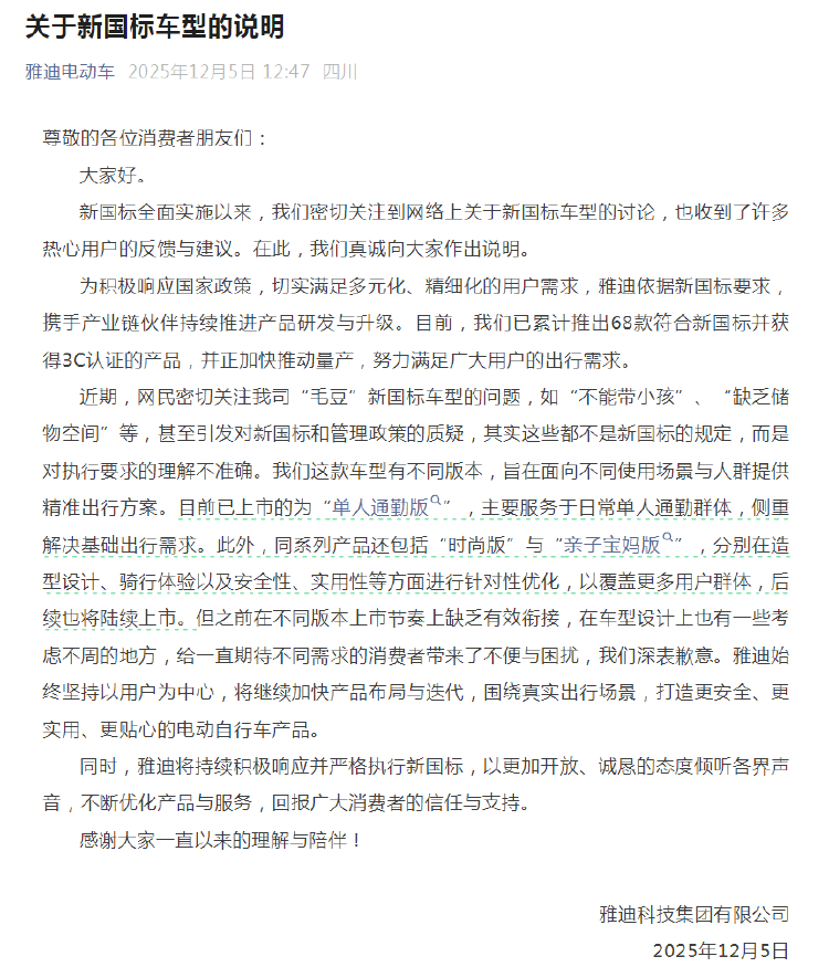 中国经济网消息,12月5日中午,雅迪科技集团有限公司发布《关于新国标车型的说明》,表示该公司生产的“毛豆”电动车(“单人通勤版”)在车型设计上有一些考虑不周的地方,给消费者带来了不便与困扰,对此深表歉意。