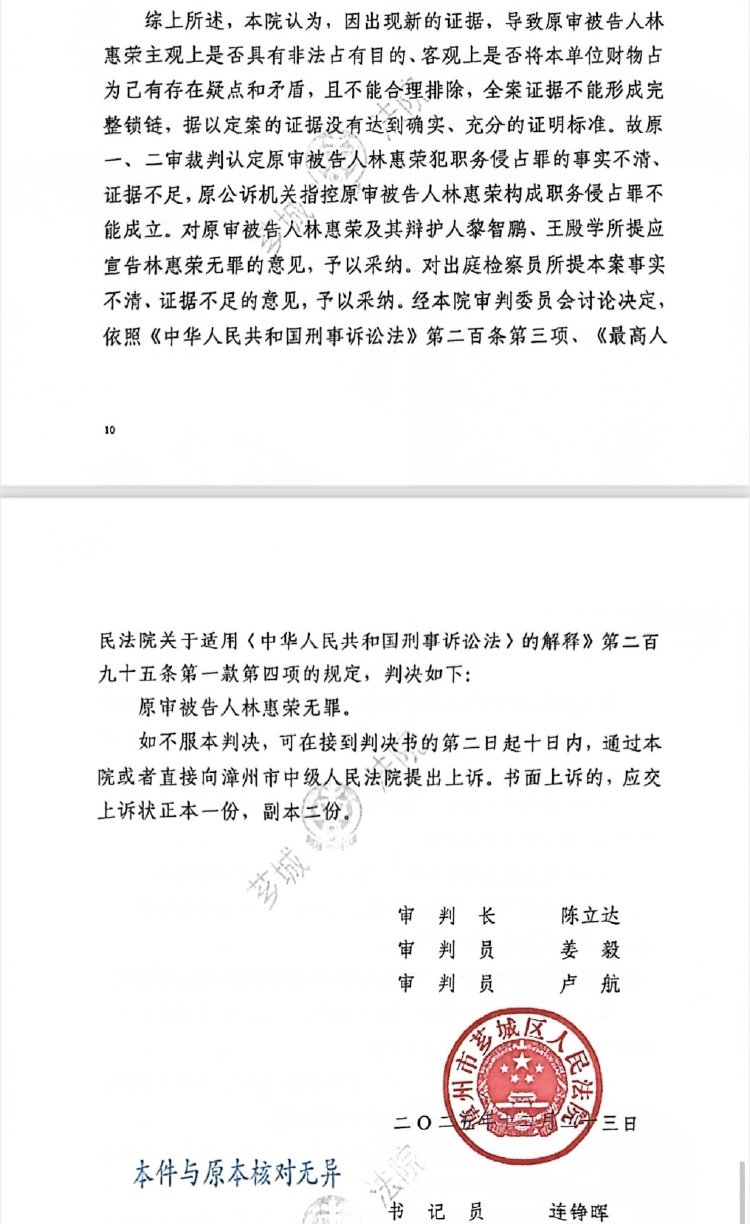 漳州市芗城区人民法院作出的林惠荣无罪判决。