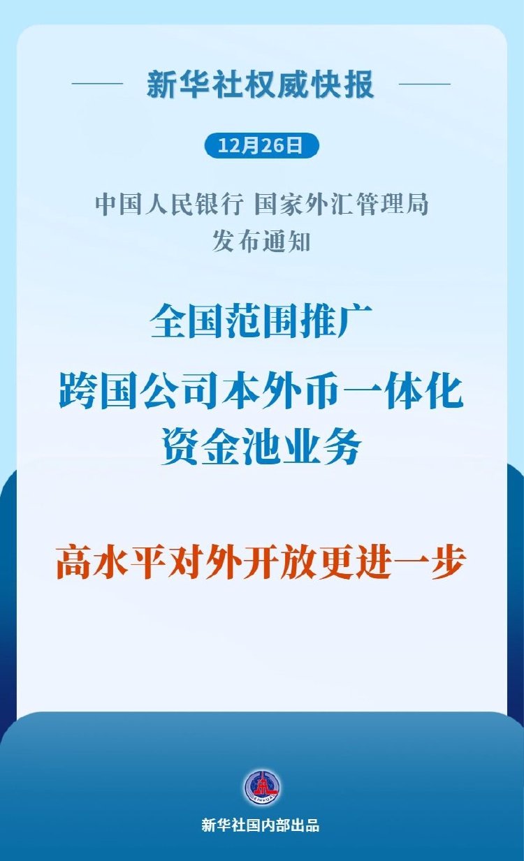 中国人民银行、国家外汇管理局12月26日发布通知,在总结前期部分地区试点经验的基础上,决定在全国范围内推广跨国公司本外币一体化资金池业务,进一步便利跨国公司集团资金归集、提高资金使用效率。该通知自发布之日起实施。