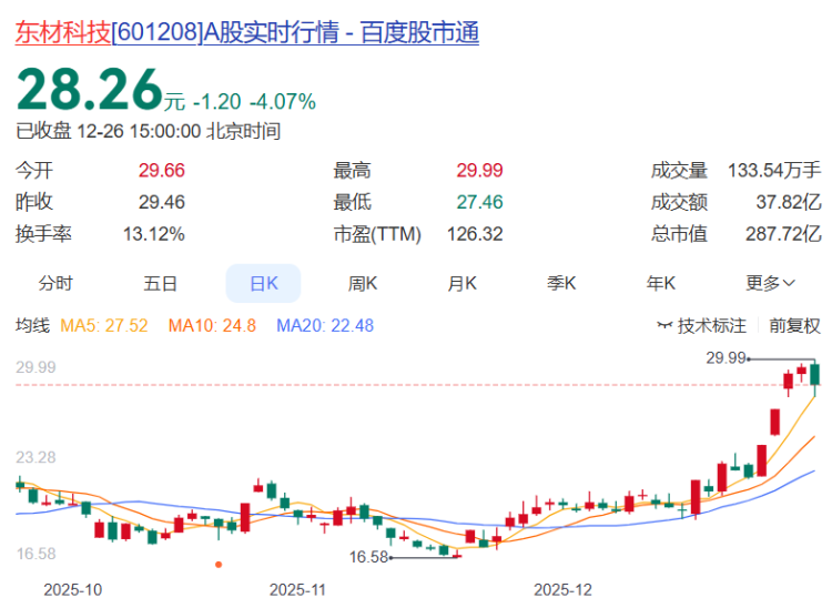 东材科技报收28.26元,日涨幅-4.07%,换手率13.12%,周涨幅28.34%,列川股第一,今年以来涨幅279.84%。