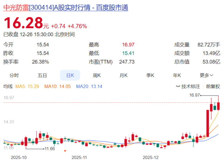 中光防雷报收16.28元,日涨幅4.76%,换手率26.38%,周涨幅25.71%,列川股第二,今年以来涨幅104.78%。
