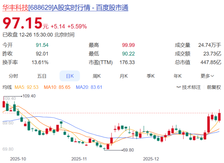 华丰科技报收97.15元,日涨幅5.59%,换手率13.61%,周涨幅25.42%,列川股第三,今年以来涨幅190.09%。