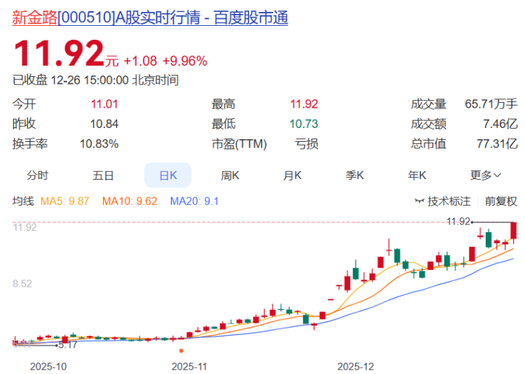 新金路报收11.92元,日涨幅9.96%(涨停),换手率10.83%,周涨幅12.67%,今年以来涨幅231.11%。