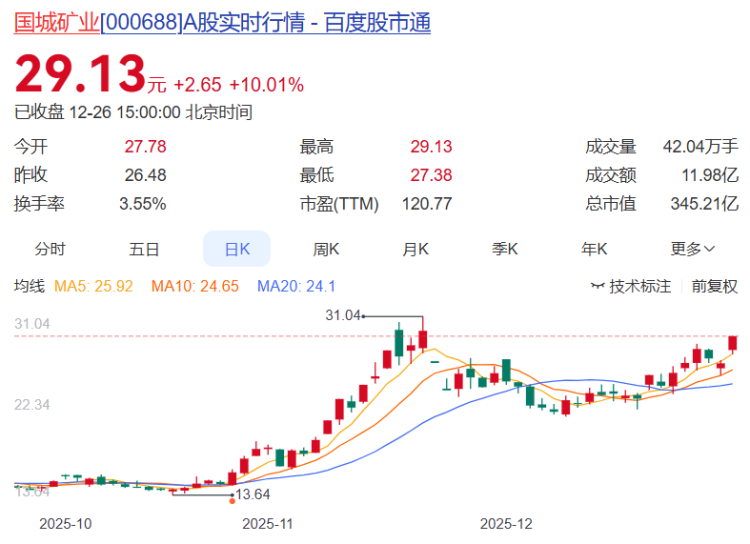 国城矿业报收29.13元,日涨幅10.01%(涨停),换手率3.55%,周涨幅14.01%,今年以来涨幅145.00%。