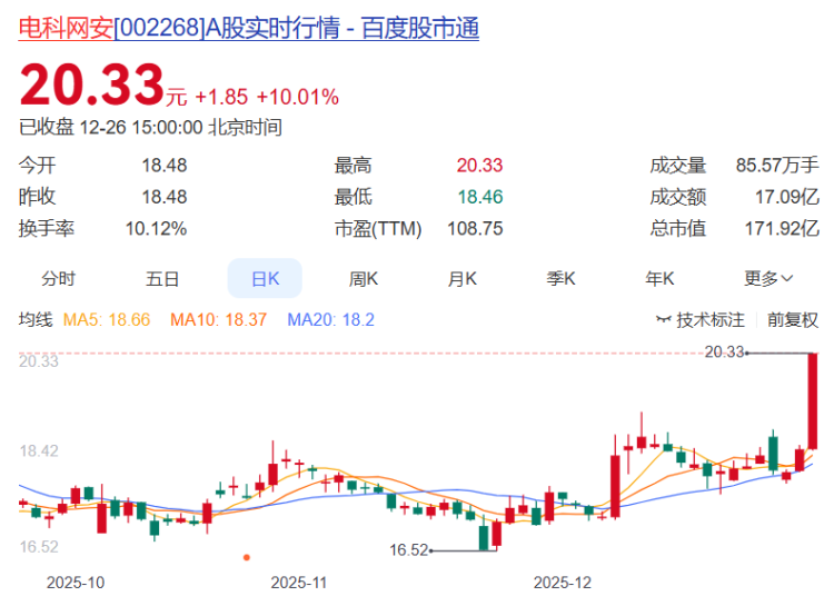 电科网安报收20.33元,日涨幅10.01%(涨停),换手率10.12%,周涨幅12.01%,今年以来涨幅25.57%。