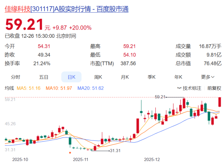 佳缘科技报收59.21元,日涨幅20.00%(涨停),换手率21.24%,周涨幅6.90%,今年以来涨幅170.81%。