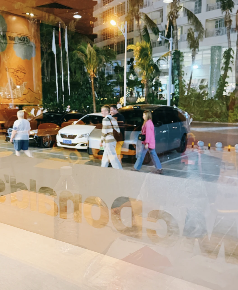 在三亚市大东海旅游区内一麦当劳餐厅外的境外游客。网络截图