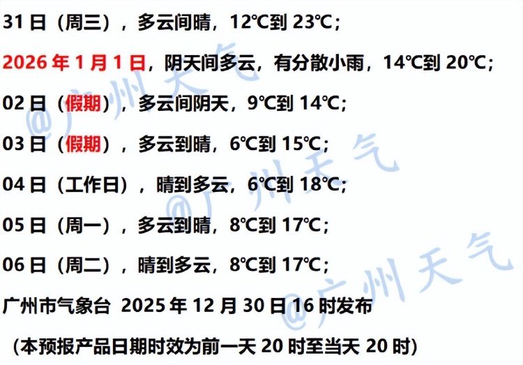 广州市气象台预计,12月31日广州多云间晴,昼夜温差大,早晚寒凉。元旦假期(1月1日—3日)广州分散小雨转多云到晴,过程降温幅度6~8℃,过程最低气温将出现在1月3日或4日早晨:北部3~5℃(山区-2~1℃,局部有霜/冰冻),中部5~7℃,南部7~9℃;陆地阵风将加大至5~7级,港区和高地阵风7~9级。元旦当天广州有雨,后面转为晴冷。