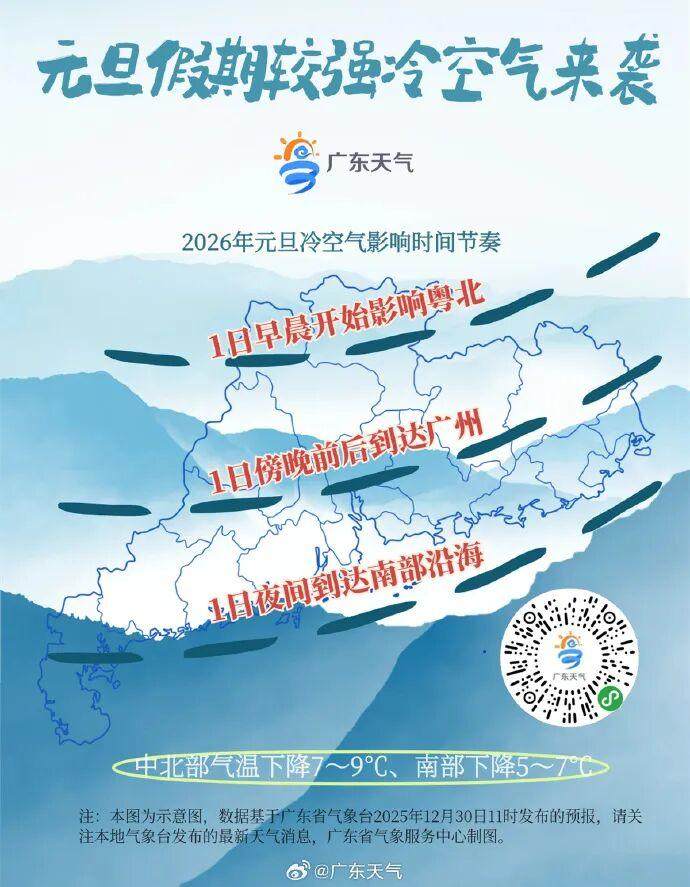 广东省气象台预计,12月31日,广东大部晴转多云。元旦假期(1月1日—3日),受较强冷空气影响,广东将有降温大风天气,1月1日阴天有分散小雨,1月2日—3日多云到晴。冷空气前锋于1月1日早晨开始影响粤北、傍晚前后到达广州、夜间到达广东南部沿海,中北部市县气温下降7~9℃、南部下降5~7℃,陆地有5~7级阵风,广东海面有6~8级偏北风,阵风8~9级。