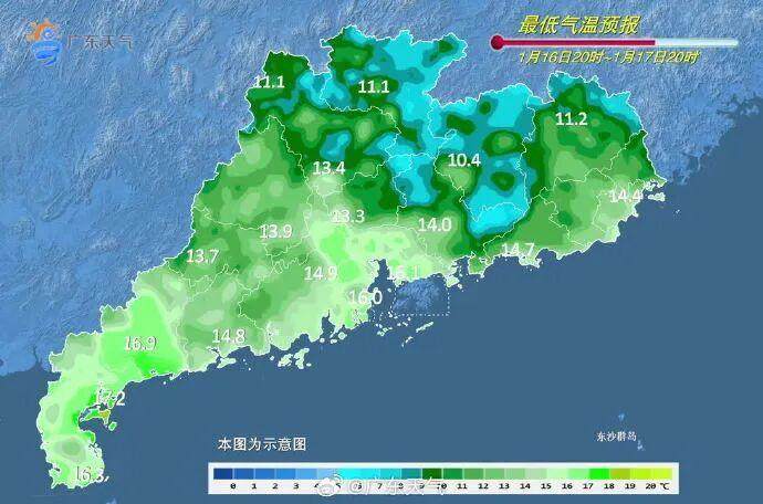 1月18日,粤北、珠三角多云间阴天,局部有零星小雨,其余市县多云。最低气温:河源、梅州、粤东市县11~14℃,雷州半岛18~20℃,其余市县14~17℃。