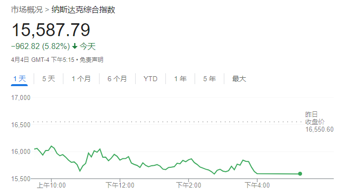 截至收盘,道指跌2231.07点,跌幅为5.50%,报38314.86点;纳指跌962.82点,跌幅为5.82%,报15587.79点;标普500指数跌322.44点,跌幅为5.97%,报5074.08点。