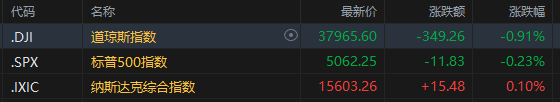 截至收盘,道琼斯指数跌0.91%,报37,965.60点;标普500指数跌0.23%,报5,062.25点,双双连跌第三天;纳斯达克综合指数涨0.1%,报15,603.26点,结束了连续两日的暴跌。