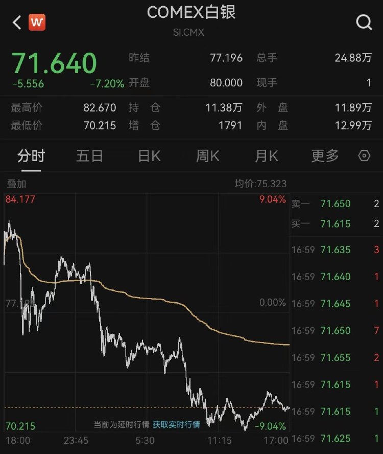 作为日内全球市场的焦点,这一轮金属上涨狂潮的“带头大哥”白银日内巨震,Comex白银期货创出每盎司82美元新高后跳水至71.6美元,黄金、铂金、钯金等品种也携手下挫。矿业板块集体下跌,First Majestic Silver跌4.13%、纽曼矿业跌5.64%,锂矿巨头美国雅保也跌3.62%。