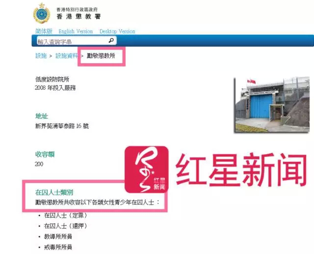 据悉,罗湖惩教所和励敬惩教所同在香港新界,在香港惩教署的官网上,励敬惩教所被标注为收容女性青少年在囚人士(见下图)。