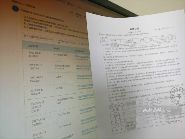 丁女士点击进入第一页几个“V”信誉企业的搜索结果,“大概谈了三家,最后综合比较价格、到货时间等选择了一家名为‘深圳市兹贺科技有限公司’的企业。”在QQ交谈中,成都商报记者注意到,双方进行了讨价还价并签了合同。丁女士向记者展示的合同上双方公司都盖了章,付款方式为对公入账,款到发货。尽管合同上写的货款是7600元,但是对方称“可以只付7500元,自己不要提成”。