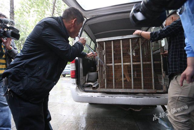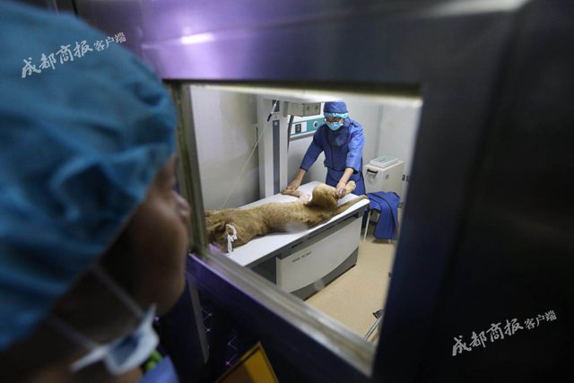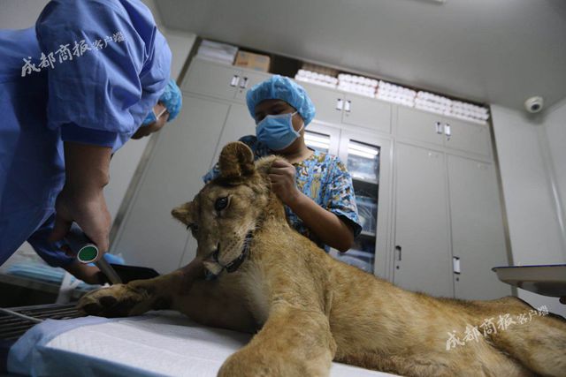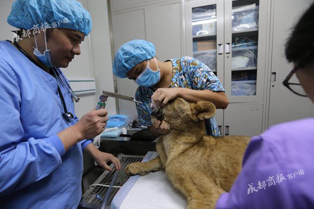 10日上午9点多,小狮子被一辆白色面包车运到华西动物医院,医生在做好手术室准备工作后,动物园工作人员使用麻醉吹管针管对小狮子进行麻醉,大约10多分钟,小狮子就睡着了。