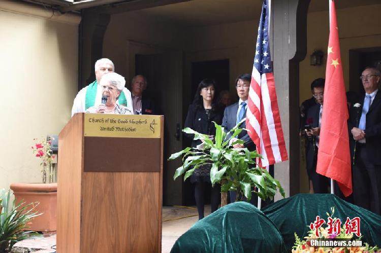 当地时间11月12日上午,威尔逊医生纪念碑落成典礼在美国加州阿凯迪亚市举行。中国驻洛杉矶总领馆官员、威尔逊家人、美国友好人士、侨学界代表等数百人出席揭幕仪式,共同纪念威尔逊医生在侵华日军南京大屠杀期间的人道义举。图为威尔逊医生的家人在仪式上致辞。