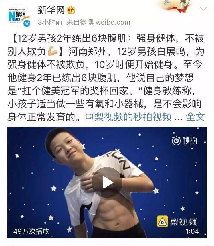 河南郑州12岁男孩白展鸣,因为希望强身健体不被欺负,10岁时便开始健身。至今他健身2年已练出6块腹肌,他说自己的梦想是“扛个健美冠军的奖杯回家。”健身教练称,小孩子适当做一些有氧和小器械,是不会影响身体正常发育的。