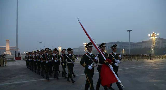 在太阳升起之前,进入天安门广场,完成升旗准备。