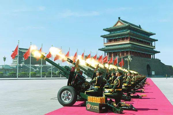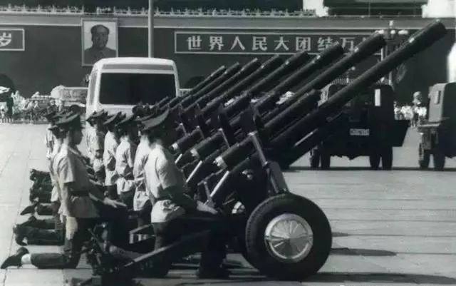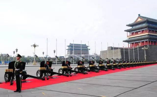 而在国家庆典时刻,则会在正阳门和毛主席纪念堂间的小广场上,以城门为中心,在东西两侧呈“八”字型分别架设起28门礼炮,总共56门。