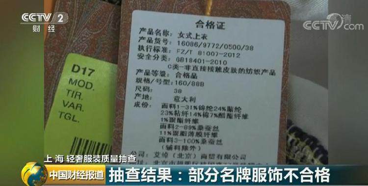 央视网消息,1月26日,上海市工商行政管理局公布了对服装的抽查结果,130个批次的轻奢纺织品中,有23个批次被检出存在质量问题,被判定为不合格产品,不合格检出率为17.7%。这些轻奢纺织品多为国际知名品牌,有乔治阿玛尼(Giorgio Armani) 、博柏利(Burberry) 、艾绰(ETRO)、纪梵希(GIVENCHY)、麦丝玛拉(MaxMara)等。
