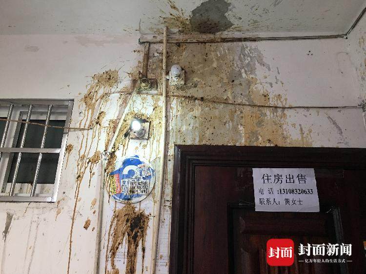 5月3日,封面新闻记者来到了东兴区农校街黄太连的单元楼下,走上二楼的楼梯,一阵恶臭就扑面而来,记者看到黄太连房子门墙上的粪水已经干涸,门上贴着一张“房屋出售”的告示。