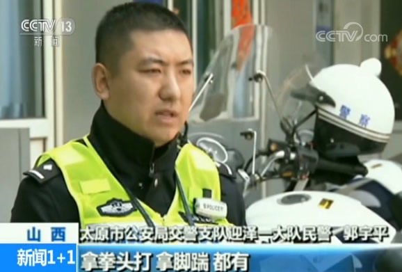 太原市公安局交警支队迎泽一大队民警 郭宇平:推搡民警,谩骂拉扯,包括拿毛巾抽打,拿拳头捣,拿脚踹……都有。