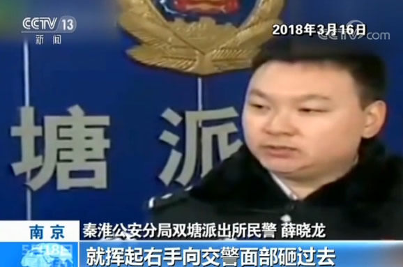 秦淮公安分局双塘派出所民警薛晓龙:(女子)右手里攥着电动车钥匙,就起右手向交警面部砸过去,交警当时鼻子就流血了,后来到医院检查,发现鼻子已经骨折了。