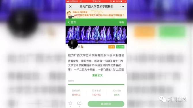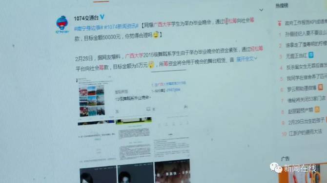 这则众筹信息在很多社交平台上热传,消息内容是:广西某高校舞蹈系毕业生由于举办毕业晚会的资金紧张,通过轻松筹平台向社会筹款,目标金额为五万元。一些网友看到后提出了不同意见。