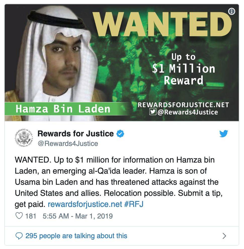 当地时间2月28日,美国国务院发布消息,悬赏100万美元寻找哈姆扎·本·拉登的情报,“正义奖励项目将对提供‘基地’组织主要头目哈姆扎·本·拉登位置或身份信息的人给予高达100万美元的奖励”。
