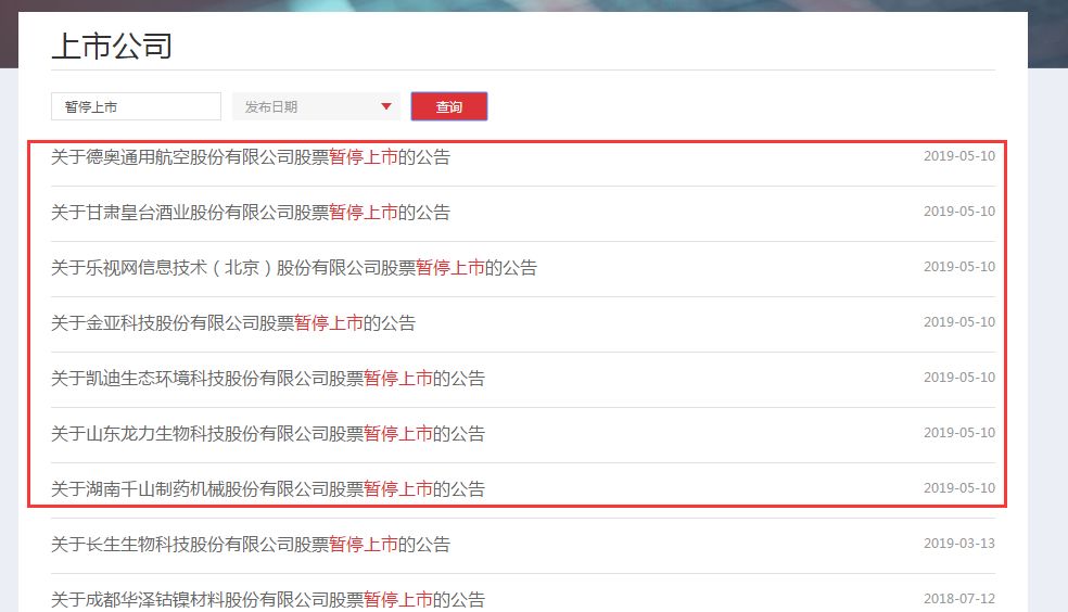 5月10日晚间,深交所网站一次性发布了乐视网、千山药机、*ST龙力、*ST凯迪、金亚科技、*ST皇台、*ST德奥等7家公司的暂停上市公告,决定暂停上述公司股票上市。