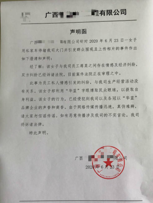 在该公司办公区,公司相关人员拿出一份《声明函》对南国早报客户端记者表示,公司想要回应的内容都在上面了。该函称,经了解,该女子与公司员工蒋某之间存在情感及经济纠纷,双方纠纷已经诉诸法院,目前案件法院正在审理之中。