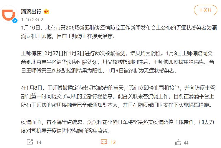 1月10日晚,@滴滴出行官方微博发布消息表示,北京新增无症状感染者为滴滴司机,所有该司机密接者已全部通知到本人。全文如下: