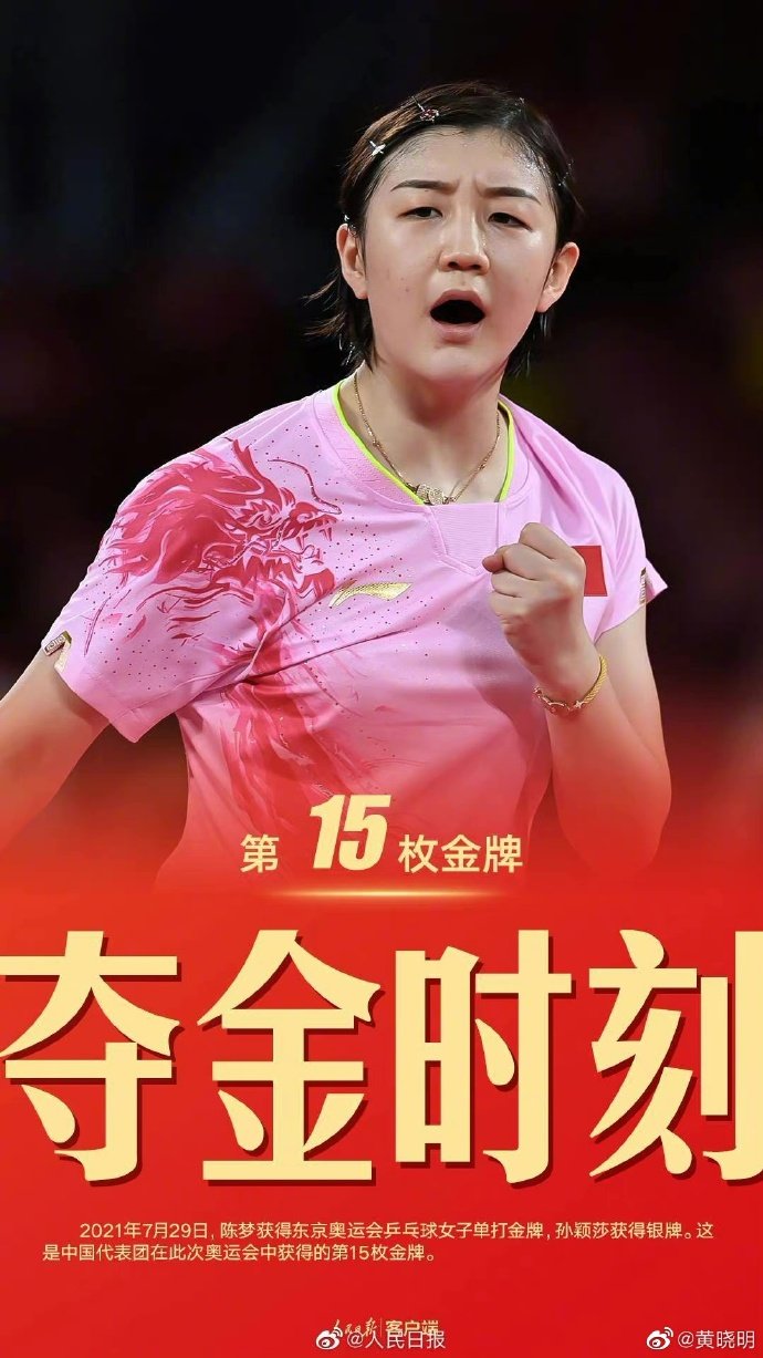 在东京奥运会女子乒乓球单打决赛中,中国选手陈梦以4:2战胜队友孙颖莎,获得冠军,这也是陈梦的第一块奥运金牌。