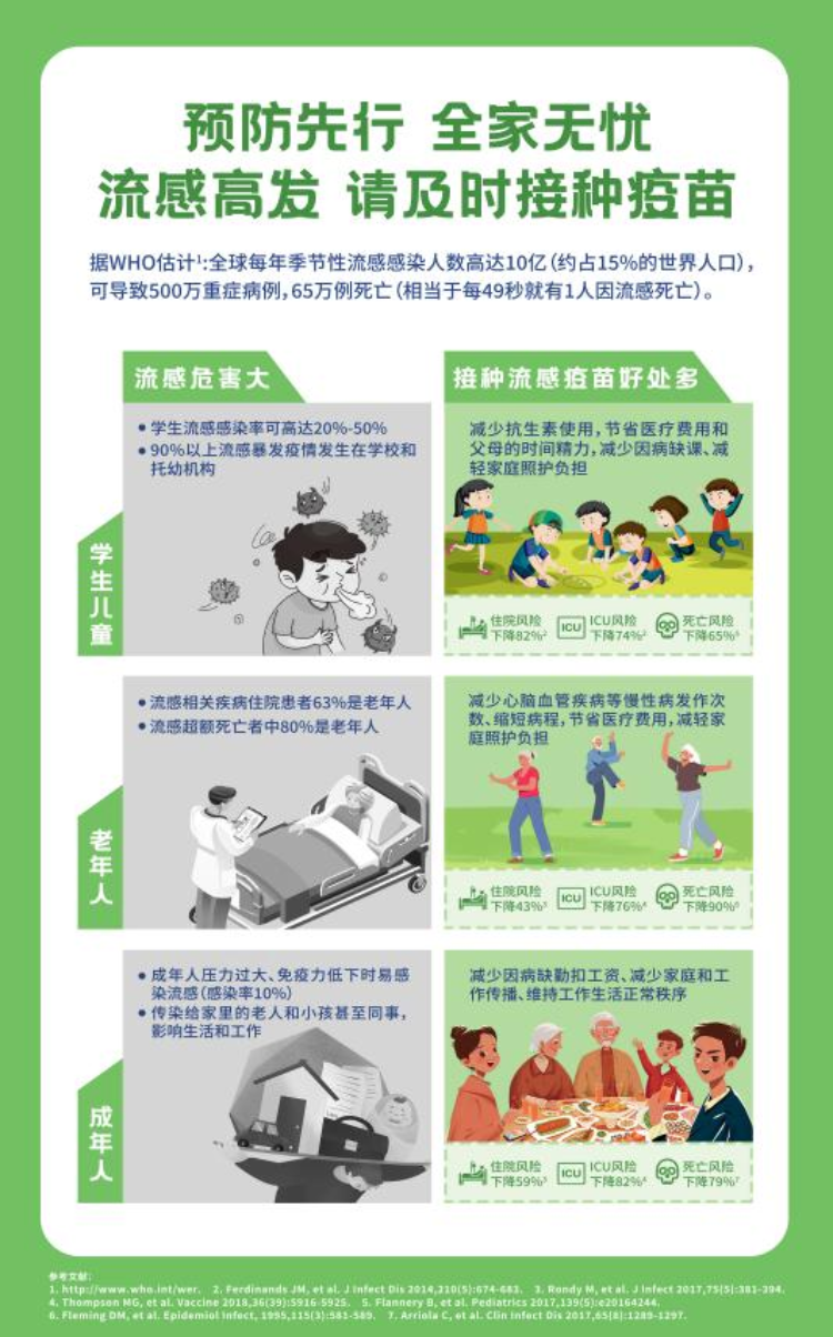 流感带来的疾病负担以及并发症是非常严重的,且全人群对流感普遍易感,每4个18岁以下儿童、青少年就有1人感染流感,每9个成年人中就有1人感染流感,每10个流感死亡者中8个是老年人。据统计,流感每年在全球造成约300万至500万例严重病例,以及约29万~65万例患者因流感相关呼吸道疾病死亡。接种流感疫苗是预防流感最有效的手段,可以显著降低接种者罹患流感和发生严重并发症的风险。