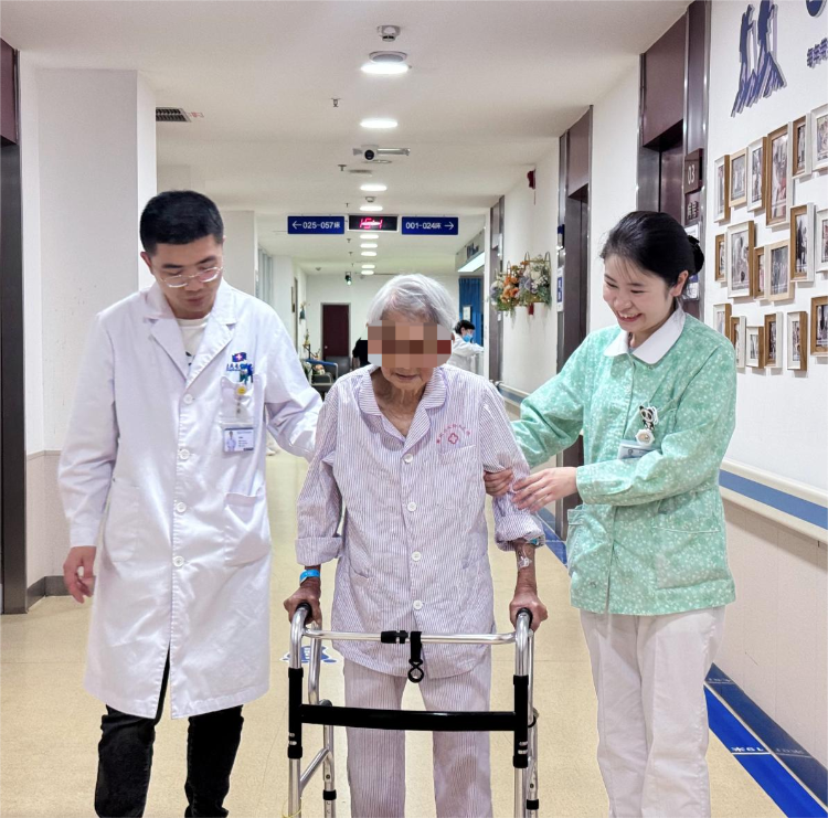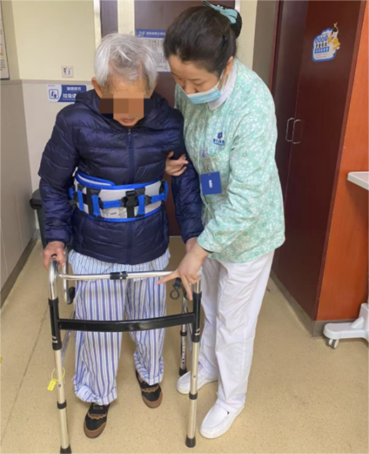 得益于医院先进的医护康一体化康复模式,梅婆婆术后当天,便在专业康复师的悉心指导下,顺利完成了床旁站立训练。在精心的治疗与护理下,术后第5天,老人已能借助助行器自主行走。