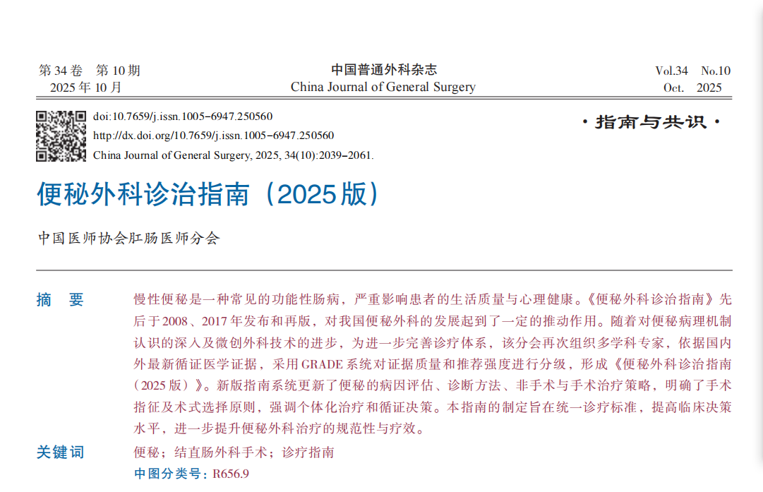 近日,由中国医师协会肛肠医师分会组织,重庆大学附属江津医院胃肠外科团队参与编写(顾问、组长和执笔)的《便秘外科诊治指南(2025版)》在《中国普通外科杂志》2025年第10期上正式发布,彰显了重庆大学附属江津医院近年来在胃肠外科学科建设取得的卓越成效及其在全国便秘外科诊治领域的学术地位。