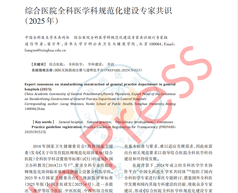 近日,由来自中国全科医生学术共同体等多位权威专家共同制定的《综合医院全科医学科规范化建设专家共识(2025年)》(以下简称《共识》)在中华全科医师杂志上正式发布。