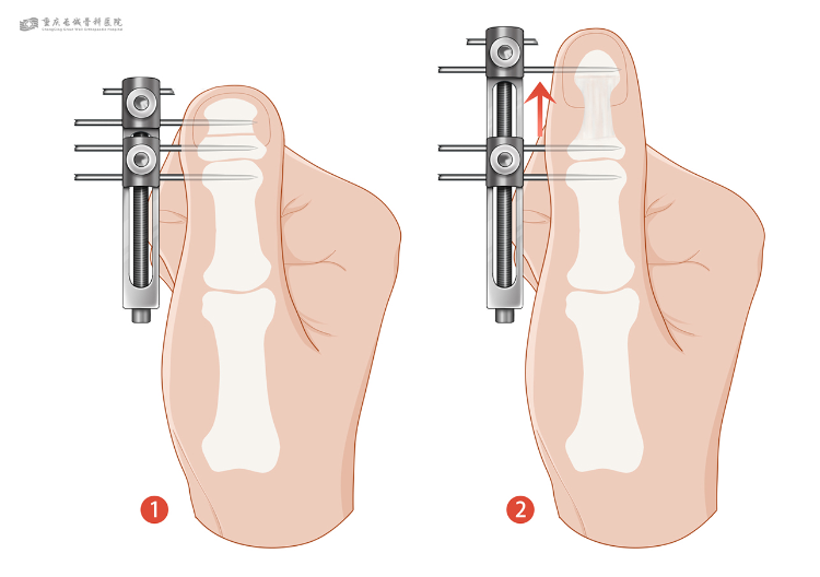 术中,医生先用单边微型外固定支架固定拇指远节指骨,再将远节指骨截断,术后通过外固定支架每日缓慢牵拉拇指远节指骨,达到延长矫正短指的效果,这样可减少损伤血管、神经的概率和多次手术的风险。术后同步进行早期功能锻炼,能避免手指僵硬影响功能。三个月左右,指甲板会重新长好,直到对手指长度满意、X线片显示指骨愈合,即可拆除外固定支架。
