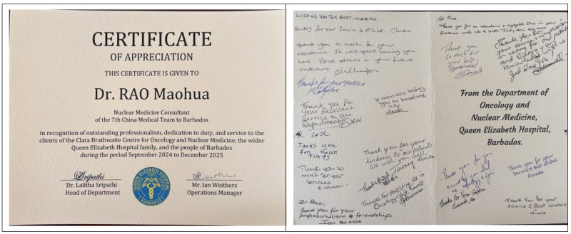 援外工作即将结束之际,伊丽莎白女王医院肿瘤核医学中心全体医务人员将一封由全科医护人员签名的感谢信郑重交到中国医疗队成员饶茂华手中。信中表达了对其专业能力、敬业精神以及真诚关怀的由衷感谢,也见证了一段跨越国界的医患情谊。