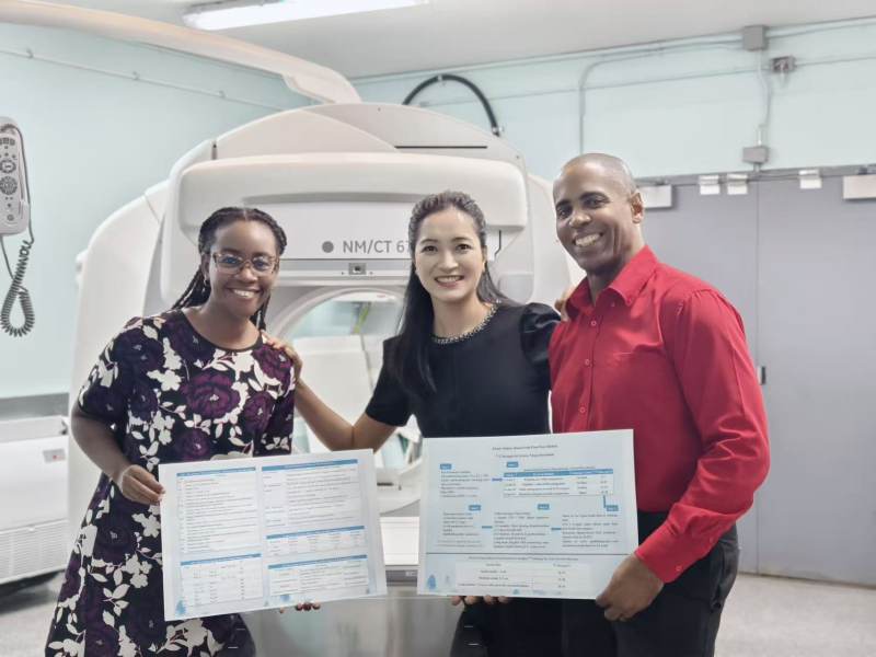 时间回到援外之初。作为第7批援巴巴多斯中国医疗队核医学科医生,饶茂华迅速融入当地医疗体系,承担起核医学临床与技术支持工作。她积极参与甲亢、分化型甲状腺癌等疾病的规范化管理,完成全身骨显像、肾动态显像、甲状腺显像及¹³¹I全身扫描等 SPECT/CT报告书写与审核,保障了当地核医学诊疗工作的平稳开展。