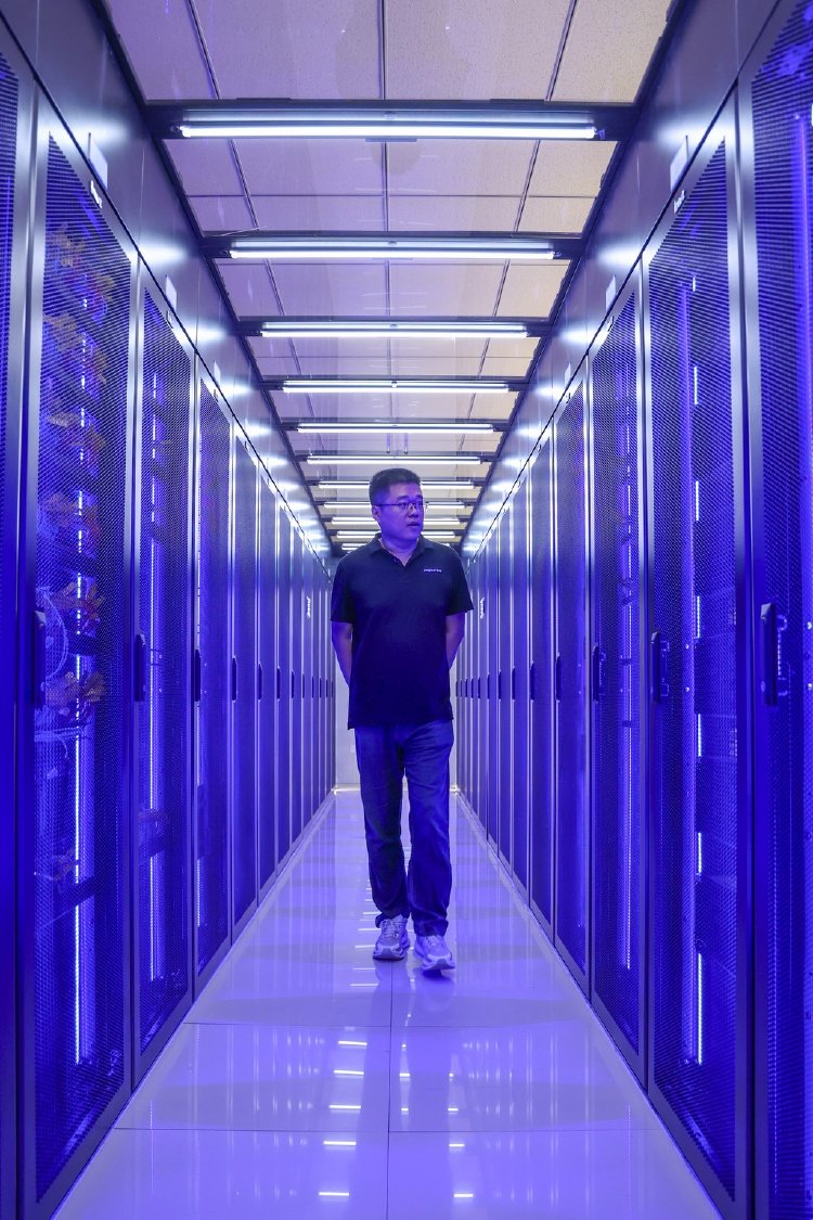 6月13日,沧州交通发展(集团)有限责任公司智算中心,荣乌高速沧州段改扩建工程项目中心算法工程师检查各类服务器运行情况。董国池摄